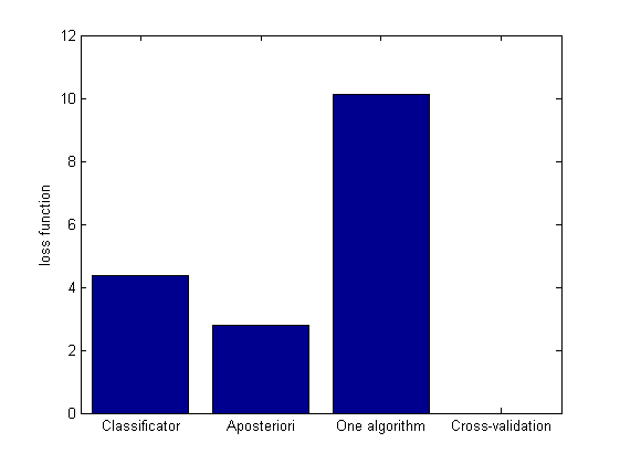 Другой путь решения — выбирать нужный алгоритм, сравнивая качество классификации с остальными алгоритмами. В реальности использовать такой алгоритм возможности нет, но для того, чтобы оценить, дает ли построенный классификтор какие-то приемущества перед одной фиксированной моделью, может быть полезен. Метки, которые раздает такой «идеальный» классификатор, получаются из уже найденной матрицы оценок взятием минимума по строкам. Также модель можно выбирать по скользящему контролю.